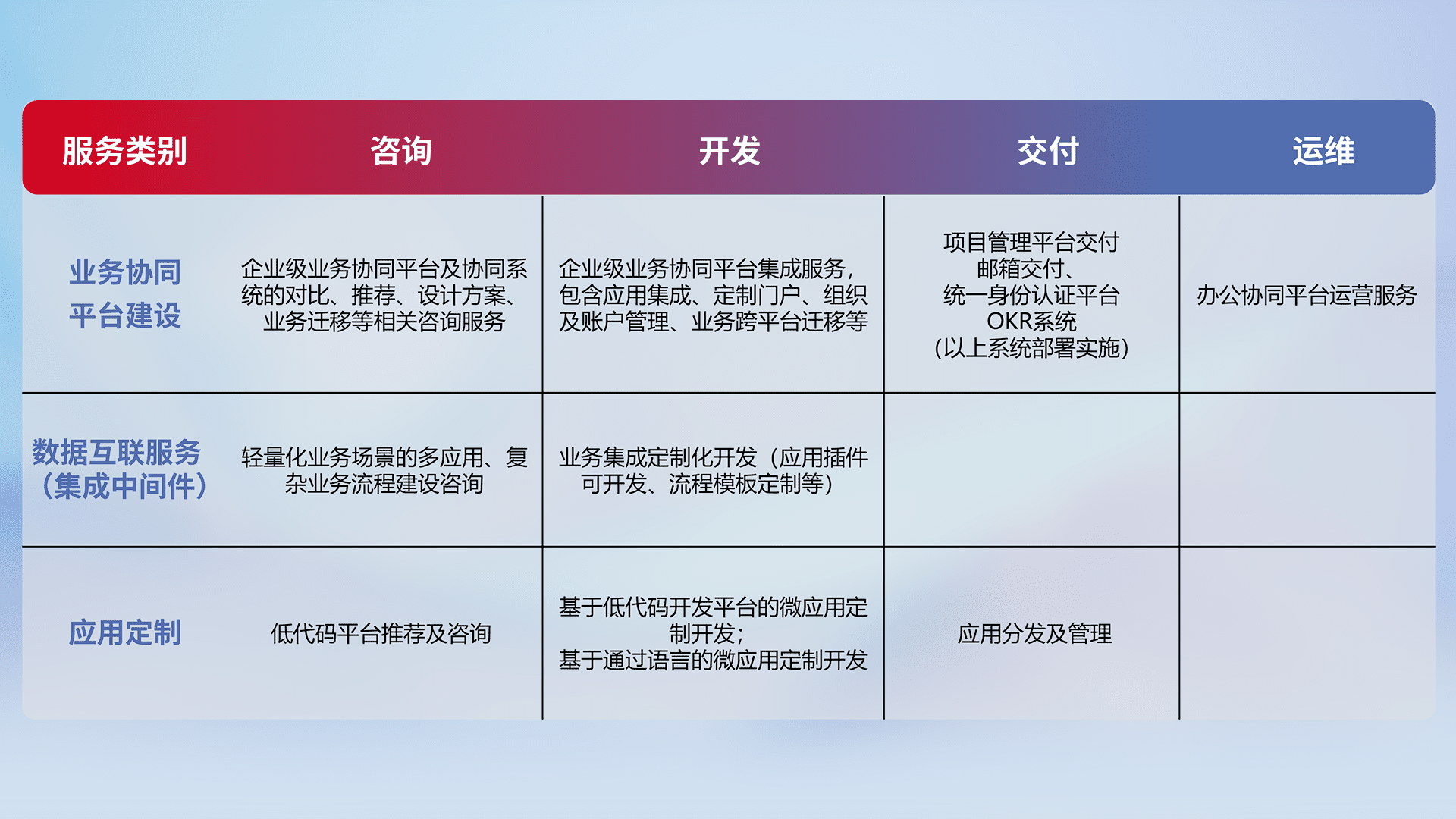 针对钉钉、、、企微、、、IDaas等平台级产品提供产品的规划、、、方案、、交付、、定制化开发等服务,,实现如统一协同办公、、、智能客户服务、、、、混合会议管理、、智能数据查询、、、等业务场景,,实现数字化转型。。。。