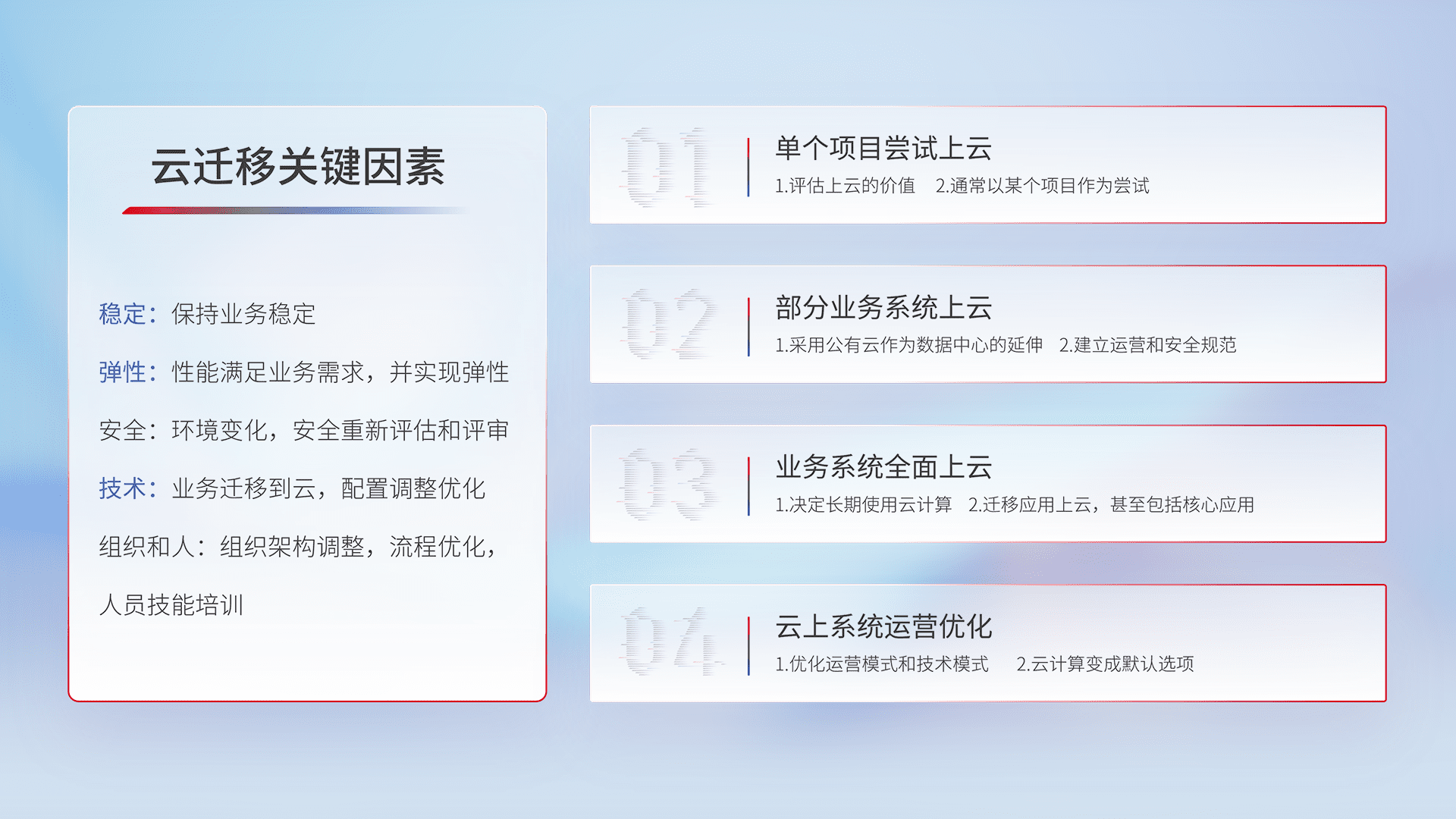 结合实际业务,,从规划设计、、云平台选型、、、、云原生改造、、、数据迁移、、、集成交付,,迁移全过程为客户识别最佳上云路径,,,做好风险识别管理,,设计网络架构、、身份权限、、、、安全审计合规、、、、操作审计、、日志审计、、、、监控告警策略、、、多站点容灾设计等,,,,对云上基础设施进行整体规划,,,提升IT治理水平,,以满足弹性、、、、高可用、、高性能的需求。。。。