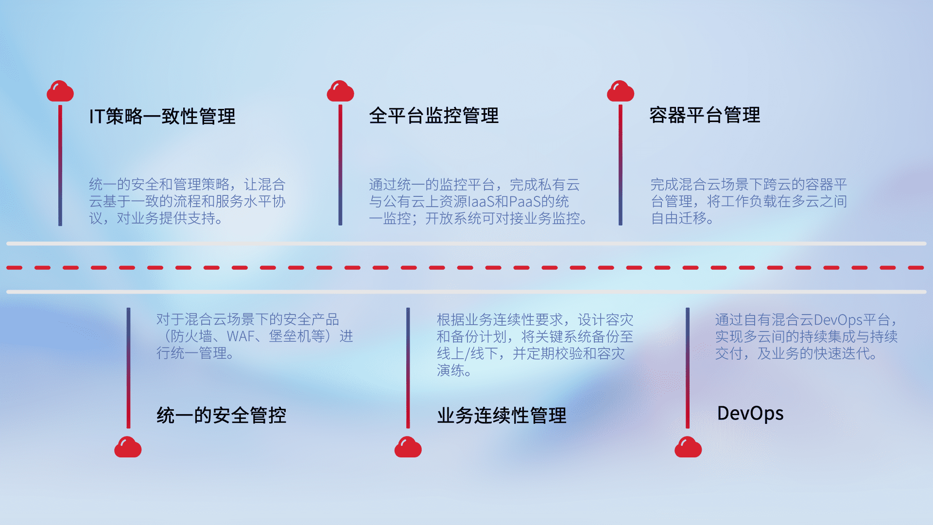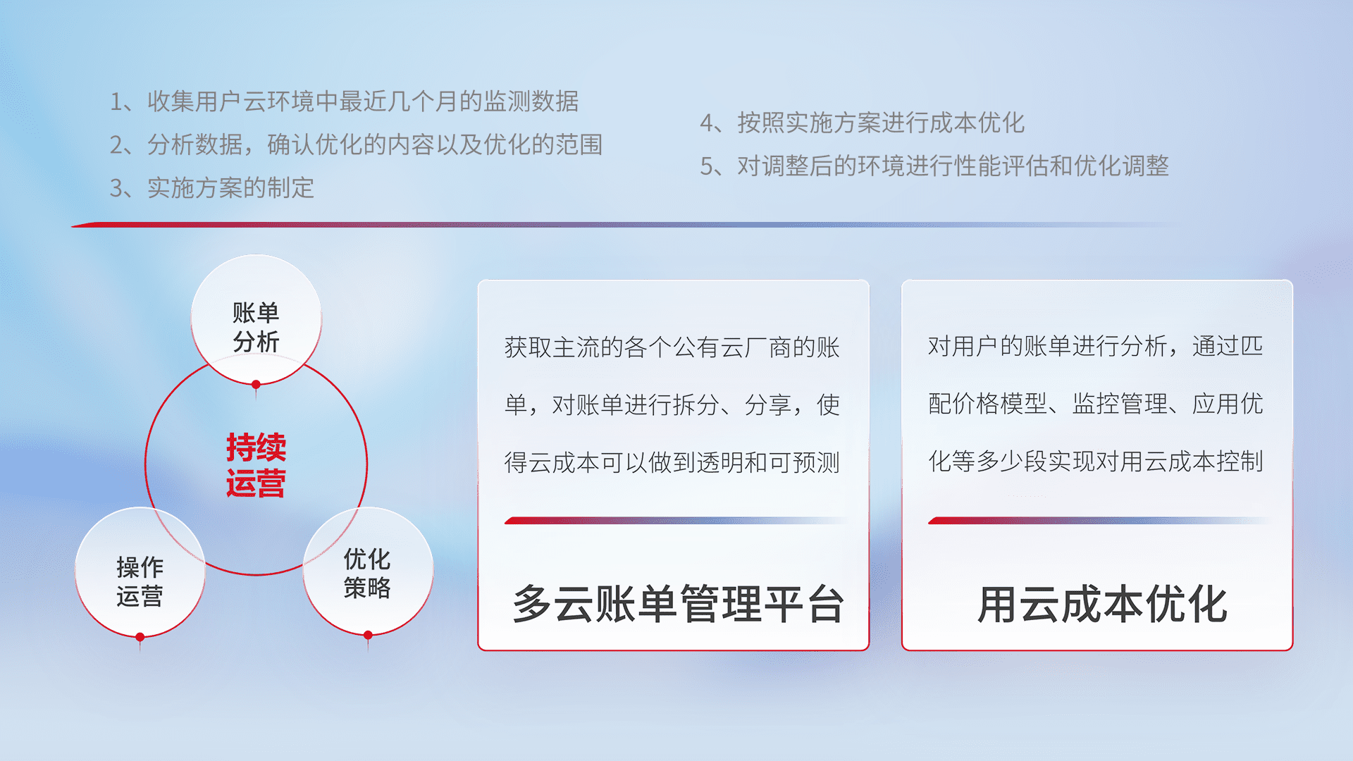 通过多云纳管,,以统一的资源数据模型把客户的云资源进行抽象和封装,,进而实现对多云资源的统一操作,,保障云资源管理的可靠性、、稳定性与可用性。。量身定制化运维内容,,,,配置、、、、开发运维、、、、补丁管理、、备份、、监控、、、、认证和访问管理、、、、审计和日常巡检等,,,,保障在用云过程中的可靠度,,稳定度以及高可用率。。。