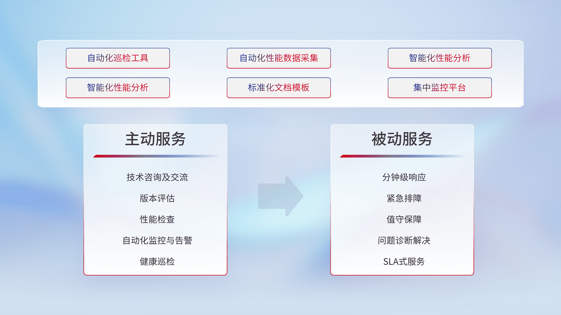 智能化工具和标准化文档,,保障服务质量,,,,提供主动服务(包含技术咨询、、版本评估、、性能检查、、、自动化监控与告警、、、健康巡检)和被动服务包含(分钟级响应、、、紧急排障、、、值守保障、、问题诊断解决、、、SLA服务)。。。